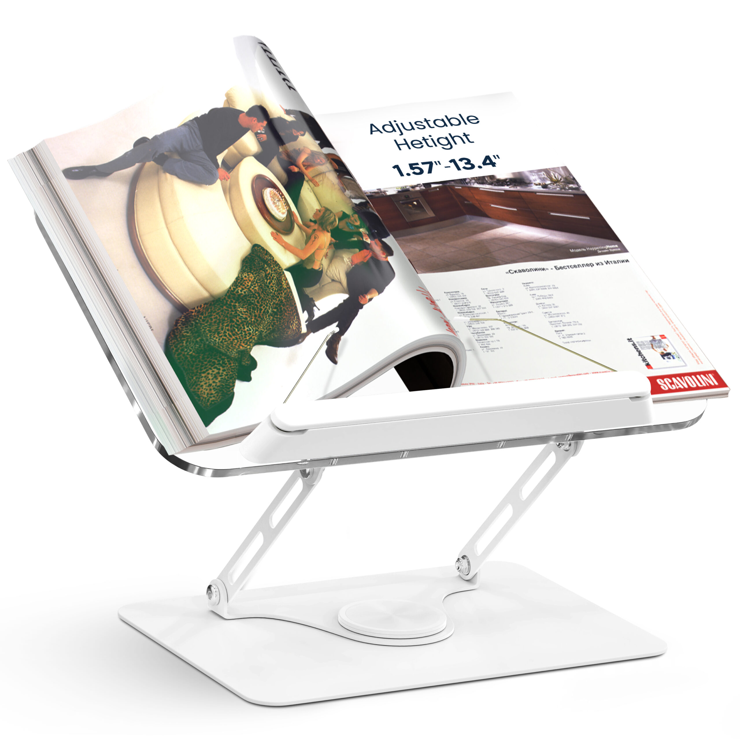 SHOPPINGALL Book Stand for Reading, Adjustable Book Holder with 360° Rotating Base, Foldable Designs, Elastic Clips, Multi-Purpose Display Riser for Recipe, Cookbook, Tablet, Laptop – SA-BLS2-White