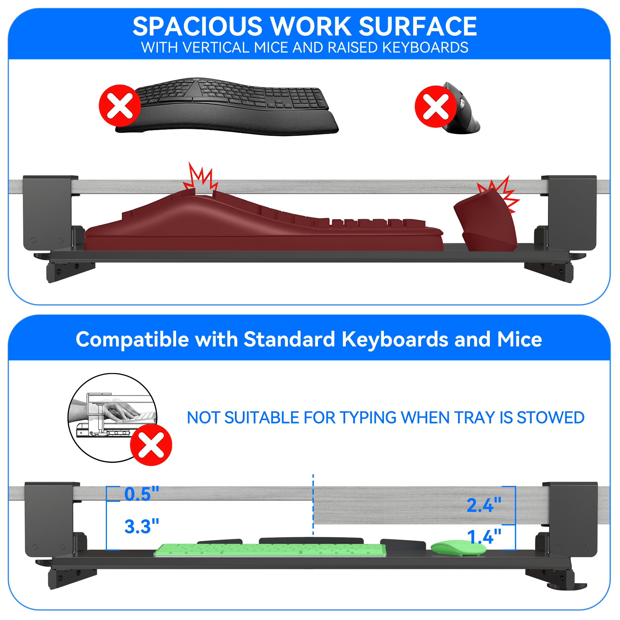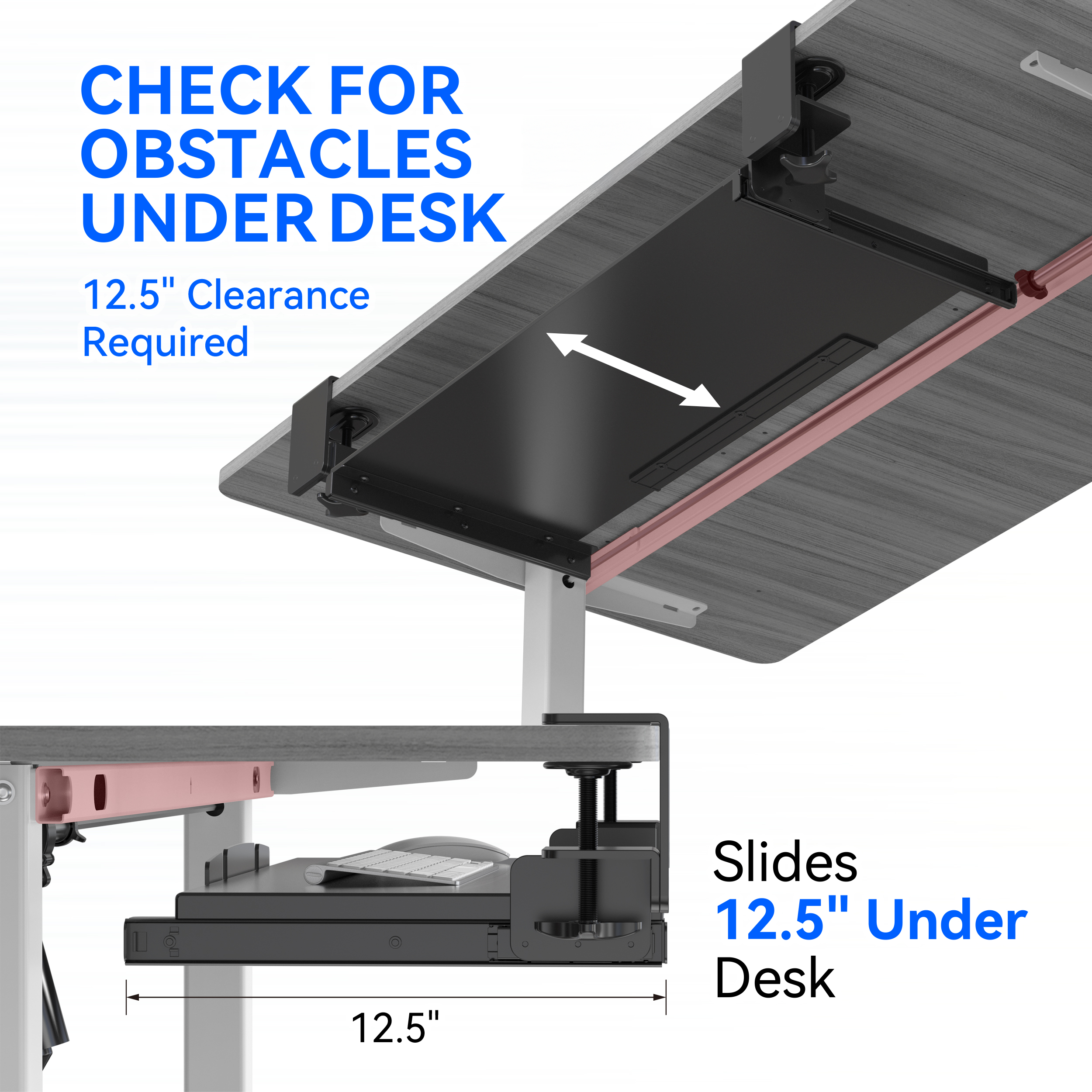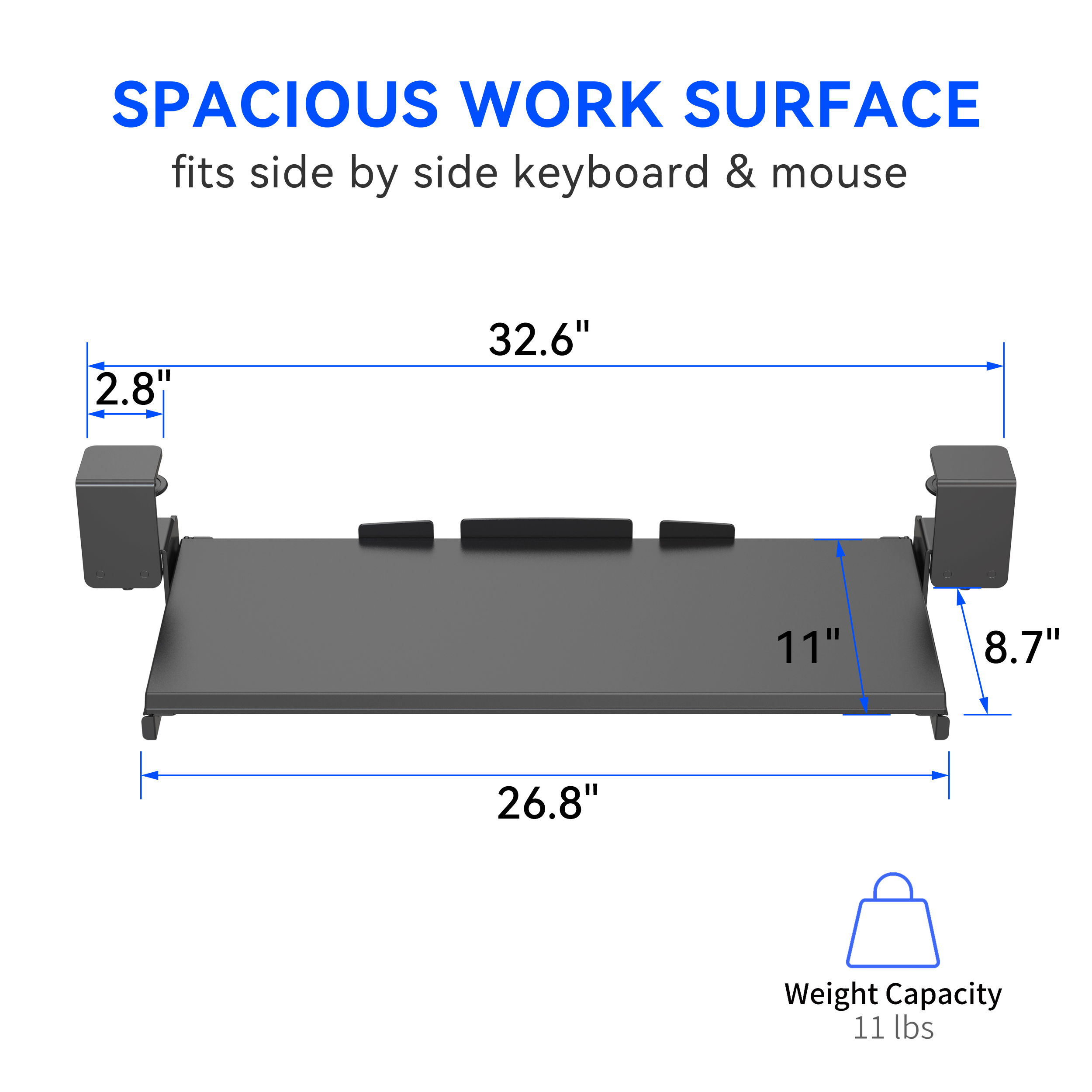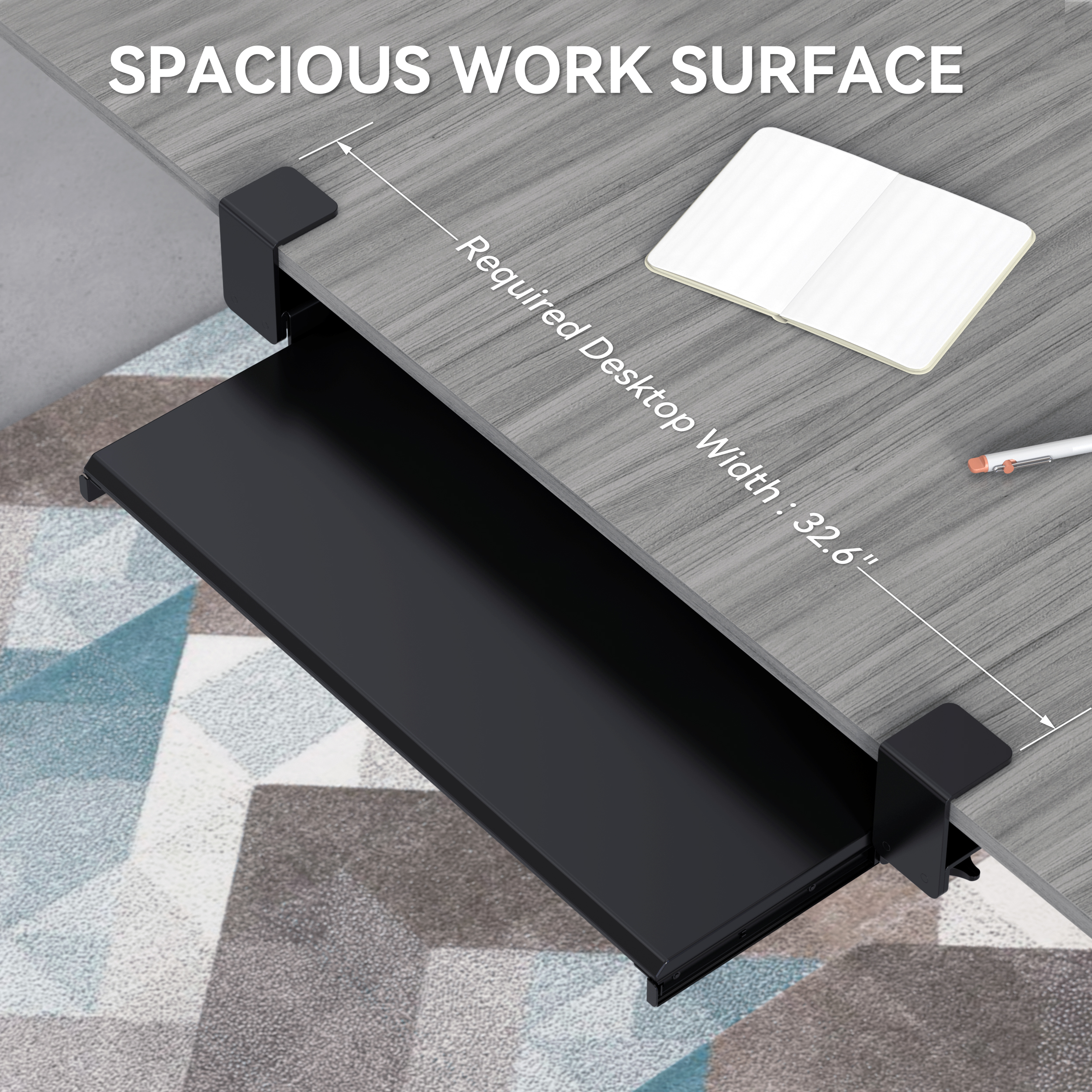 - DIMENSIONS: Large keyboard tray measures 26.7”/67.8 cm wide by 12.5”/31.8 cm in depth, providing ample space for keyboard and mouse setup